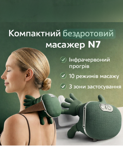 Компактний бездротовий масажер N7 — це зручний і ефективний пристрій для зняття м’язової напруги та втоми. Він підходить для масажу шиї, плечей, спини, попереку, рук і литок. Завдяки інфрачервоному підігріву масаж стає глибшим і приємнішим, покращується кровообіг і прискорюється відновлення м’язів.